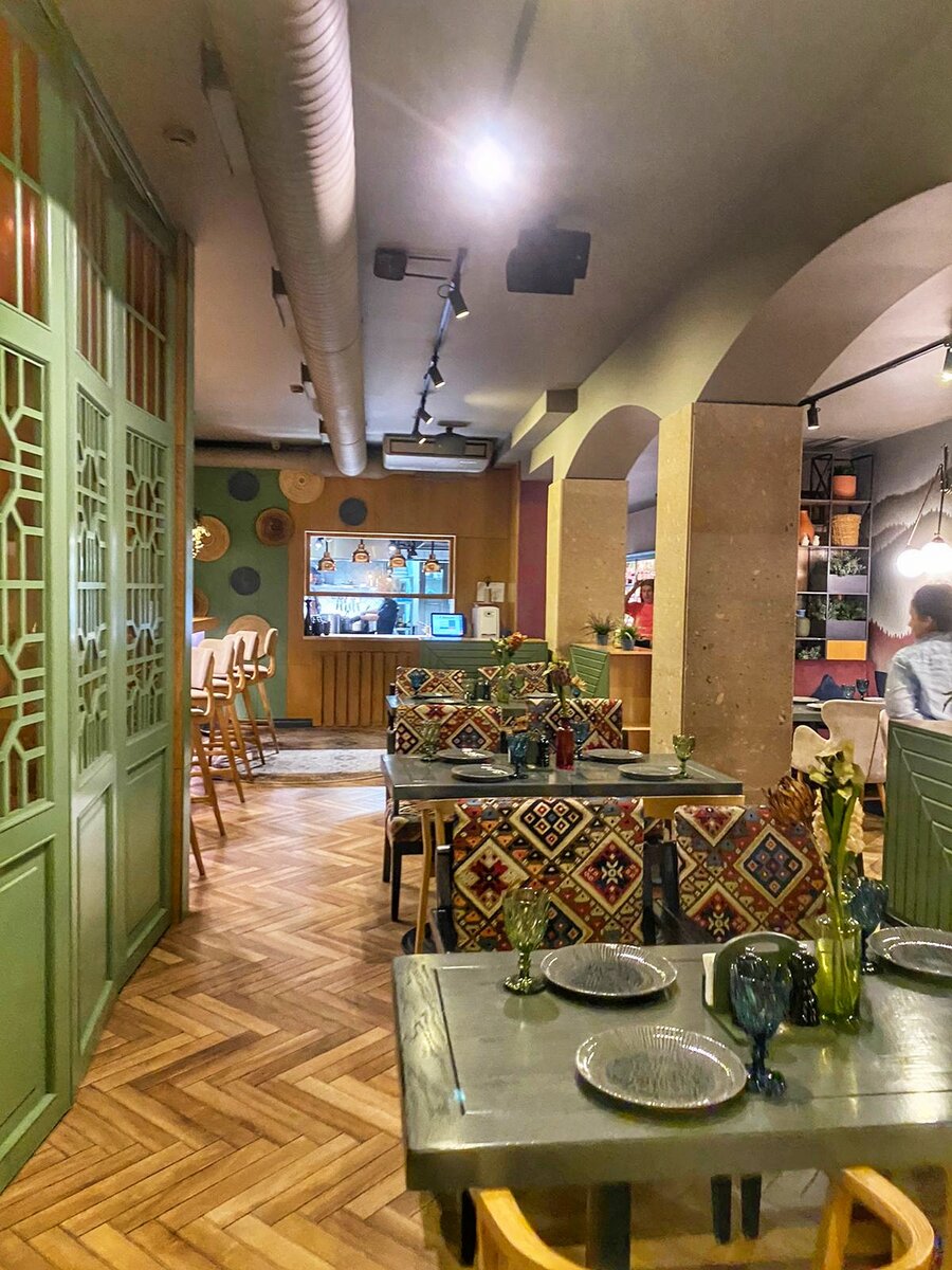 Всем привет, дорогие читатели и гости канала! Сегодня предлагаю вместе со мной побывать в одном из популярных ресторанов Анапы. Заглянула я туда по рекомендации друзей во время недавней поездки к морю. Пасмурная дождливая погода располагала к тому, чтобы укрыться где-нибудь ненадолго и сытно пообедать. Людей в заведении было немного. Интерьер мне показался довольно уютным. В основном, теплые оттенки, много небольших интересных деталей, есть диваны, на которых можно расположиться. Красноречивее слов, конечно, скажут фотографии. Называется это место "Брынза". Понравились необычные светильники в виде глиняных сосудов. Они висели над столом в ряд. Очень атмосферно, настраивает на позитивный лад. Такой декор я встретила впервые. Был тут и традиционный для многих заведений юга, Кубани в том числе, шкаф с закатками. Не знаю, можно ли их приобрести и захватить с собой или это только для красоты. В общем, выглядело довольно аппетитно. А что же в меню? Например, хаш. Это жирный густой бульон