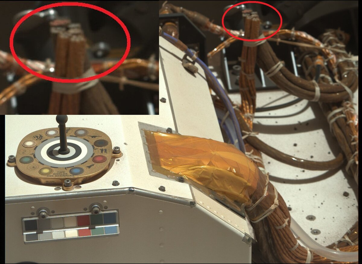 Гостей на марсе- то нету. Если есть-то кучи разбитого хлама в огороде. очередной фэйк НАСА Это тросы-оборванные кончики(возможно стальные между прочим, многожильные+ какие-то провода) для крепления ровера к «Небесному крану», если вы не знали. Вот интересно-гутарят, что пиропатрон взрывается и трос разрывает, чтоб отчепиться--взрыв штука такая-осколки во все стороны-а если кумулятивный заряд-расплав--куды пропали следы?-должно хоть чуть-чуть поцарапать и железом БЛЕСТЯЩИМ покрошить вокруг и ошметками-а рядом механизмы и провода-это как, попробуйте сами взорвать и чтоб ничего не повредить и не насорить. знаю способ с ножницами по металлу или клещами-чтоб жгут перерезать, химией можно. Если стальные тросы конечно--то они,как я наблюдаю, ржавые, а кислорода на марсе в атмосфере почти нет и блеска металла вообще нет, хоть от кончиков проводов. иначе это ТАКОЕ с торчащими скрутками вообще зачем? а что за желтая аномалия на тросе внизу под малым кружком красным, ума не приложу? еще одна