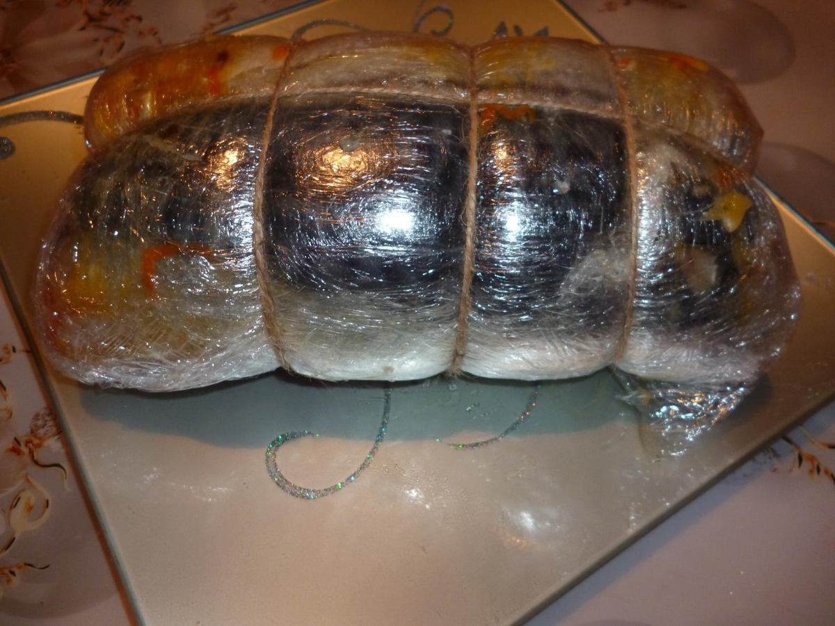 Ингредиенты: скумбрия замороженная-2 шт; морковь-500 г; яйцо-5 шт; помидоры- 300 г; лук репчатый-2 шт; желатин-20 г;специи, соль- по вкусу;растительное масло;пищевая пленка, шпагат.