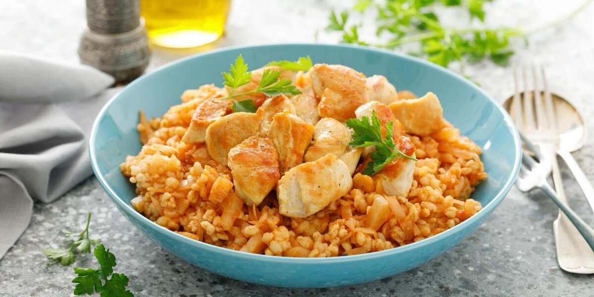 3․В ту же сковороду выложите булгур. Добавьте томатную пасту, лимонный сок, соль и перец.