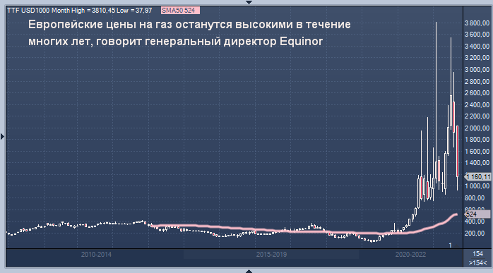 Европе придется платить экономикой за свою внешнюю политику График цены ближайшего фьючерса на спотовый индекс газа TTF на бирже ICE Futures (в долларах США за тысячу кубометров) интервалами в 1 неделю. Цена на газ в Европе останется высокой в ближайшие годы после сокращения поставок из России, заявил в пятницу исполнительный директор норвежской Equinor. Компания, которая в этом году обогнала российский "Газпром" в качестве крупнейшего поставщика газа в Европу, утром в пятницу сообщила о рекордной прибыли за третий квартал благодаря скачку цен на энергоносители. «Фундаментальная проблема в Европе — это нехватка газа, и со временем дефицит будет сохраняться, и если Европа хочет привлечь газ на свой рынок, ей придется заплатить высокую цену в ближайшие годы», — заявил на пресс-конференции генеральный директор Андерс Опедал.«Наш вклад будет состоять в том, чтобы добывать как можно больше, и наш газ останется ценным в предстоящие годы», — сказал он. По материалам Thomson Reuters MarketSn