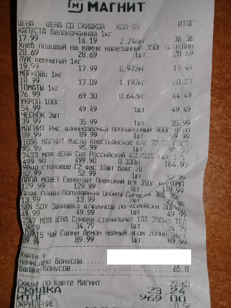 Доброго всем времечка! Расскажу и покажу, что покупала в "Магните" в прошлые выходные. Итак, делюсь: чек на сумму 969 рублей Купила много овощей, так как своего огорода нет. Картофель мы покупаем мешками в сентябре и храним в подвале, мелочевку подкупаю в течение года раз в неделю: 1) Капуста белокочанная - всего 16,19 рубля за 1 кг (в вечернее время в нашем "Магните" скидка на овощи и фрукты 10%, что радует. Мой вилок вышел на 36,36 рубля. 2) Лук репчатый - 1 кг 17,99 рубля. Взяла на 17,49 рубля. 3) Морковь - 1 кг 17,09 рубля. Купила на 20,37 рублей 4) Помидоры - 1 кг 69,30 рубля. Купила на 44,49 рубля 5) Укроп 100 грамм - 49,49 рубля 6) Чеснок - 3 штуки в упаковке - 35,99 рубля. Другого, на развес, не было, пришлось взять этот, так как муж купил свинину в магазине "Светофор", срезал с нее сало и пропалил повторно шкурку. И я солила вечером сало. 7) Хлеб - половина буханки - 28,69 рубля. Хлеб есть и подешевле, но муж предпочитает такой - нарезанный подовый на камне. Не знаю, почему, н