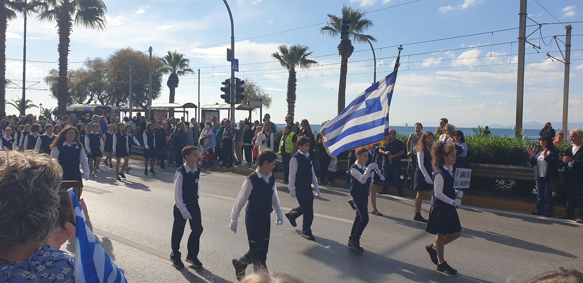 Сегодня 28 октября в Греции большой праздник, который отмечается каждый год в память о событиях 1940 года. Тогда весь греческий наро сказал OXI, что означае НЕТ итальянской оккупации во время Второй Мировой Войны В этот день во всех райноах больших и малых городов, в каждом селе, а даже самой малой деревушке проходит торжественный парад. Это важное событие в жизни Греции - на всех домах, площадях и вдоль дорог развеваются государственные флаги Детки самых младших классов у памятников рассказывают стихи, возлогают венки и потом с гордостью шагают а праздничном пааде