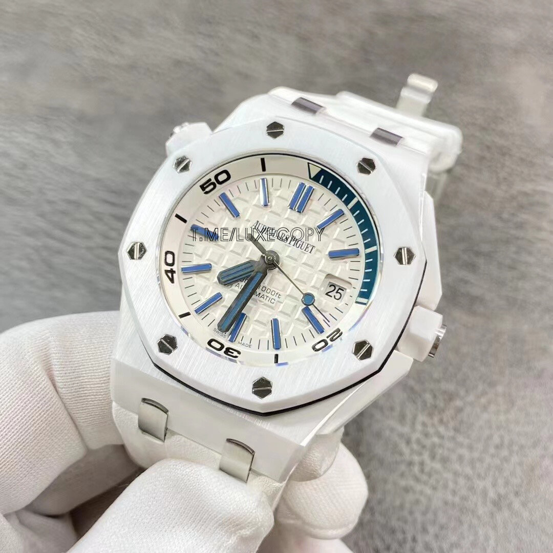 Я не понимаю как можно было это повторить , честно Эта модель это верх искусства ! Audemars Piguet Royal Oak Offshore Diver White Ceramic Характеристики Reference 15707CB.OO.A010CA.01 Механизм Audemars Piguet Cal. 3120 (Модифицированный Miyota Cal. 9015). Автоматический с возможностью ручного завода главной пружины; Корпус Сложной конструкции: Матированная белая керамика; Титановый сплав Titanium (задняя крышка, винты, застежка, заводная головка, система вращения безеля и т.д.); Размер 42 х 13,8 мм. (42 - по безелю) Водозащита 10 ATM Функции Часы, минуты, секунды, дата, время ныряния на шкале внутреннего вращающегося ранта (управление осуществляется при помощи закручивающейся кнопки, расположенной в отметке на 22.00 часов. При вращении ранта ровно 60 щелчков). Стекло Сапфировое стекло, с внутренним просветляющим антибликовым покрытием и антибликовым покрытием на увеличительном окне; Циферблат Белый, гильошированный (Mega Tapisserie). Часовые метки, дайверские метки на вращающемся