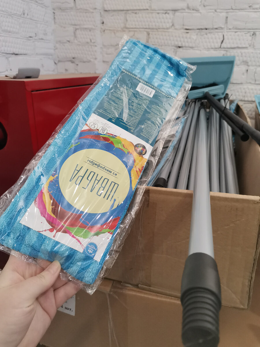 В "Светофоре" не совсем удобная для меня швабра, ибо нужно каждый раз снимать эту тряпку и вручную её промывать, а после отжимать, однако это все равно удобнее, чем мыть без швабры вообще. Такая, как на фото, стоит 186 рублей. Тряпка из микрофибры, сама швабра регулируется по высоте, но ручка довольно "хрупкая", не стоит прилагать слишком много усилий, чтобы случайно её не сломать. А так вполне нужная в хозяйстве вещь, ещё и дешёвая, поэтому от меня плюс, даже несмотря на маленькие недостатки.