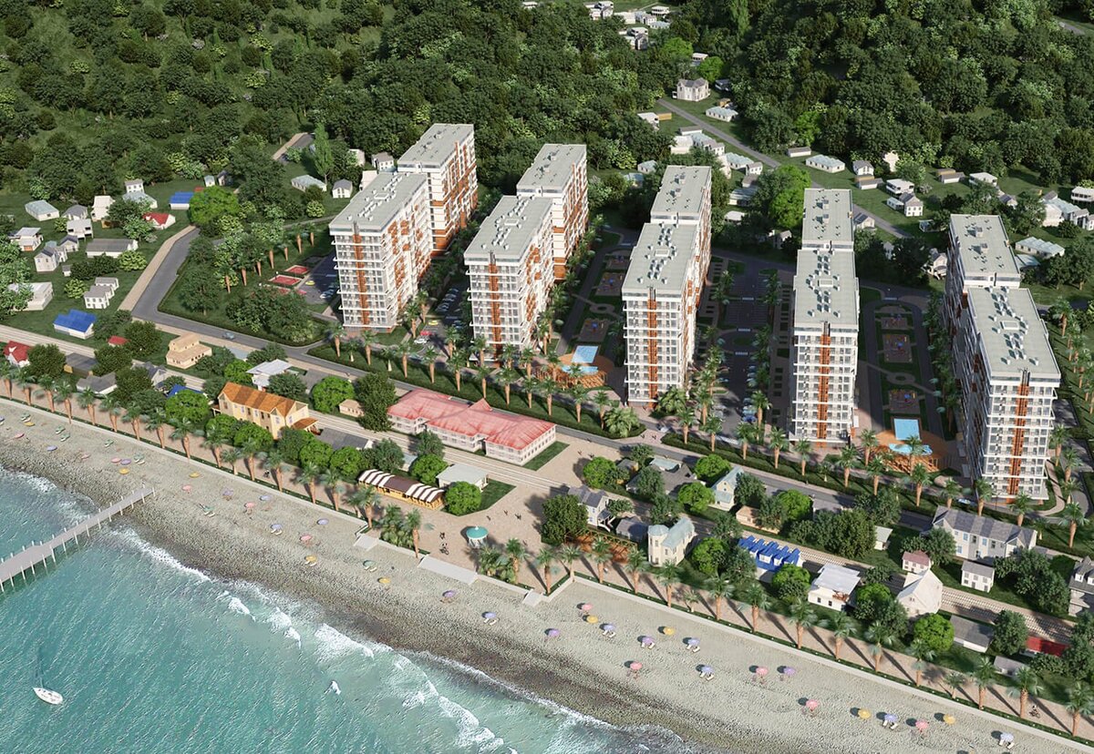Жилой комплекс расположен в так называемой «первой береговой линии». Максимальное время пешей прогулки к морю составляет 5 минут.