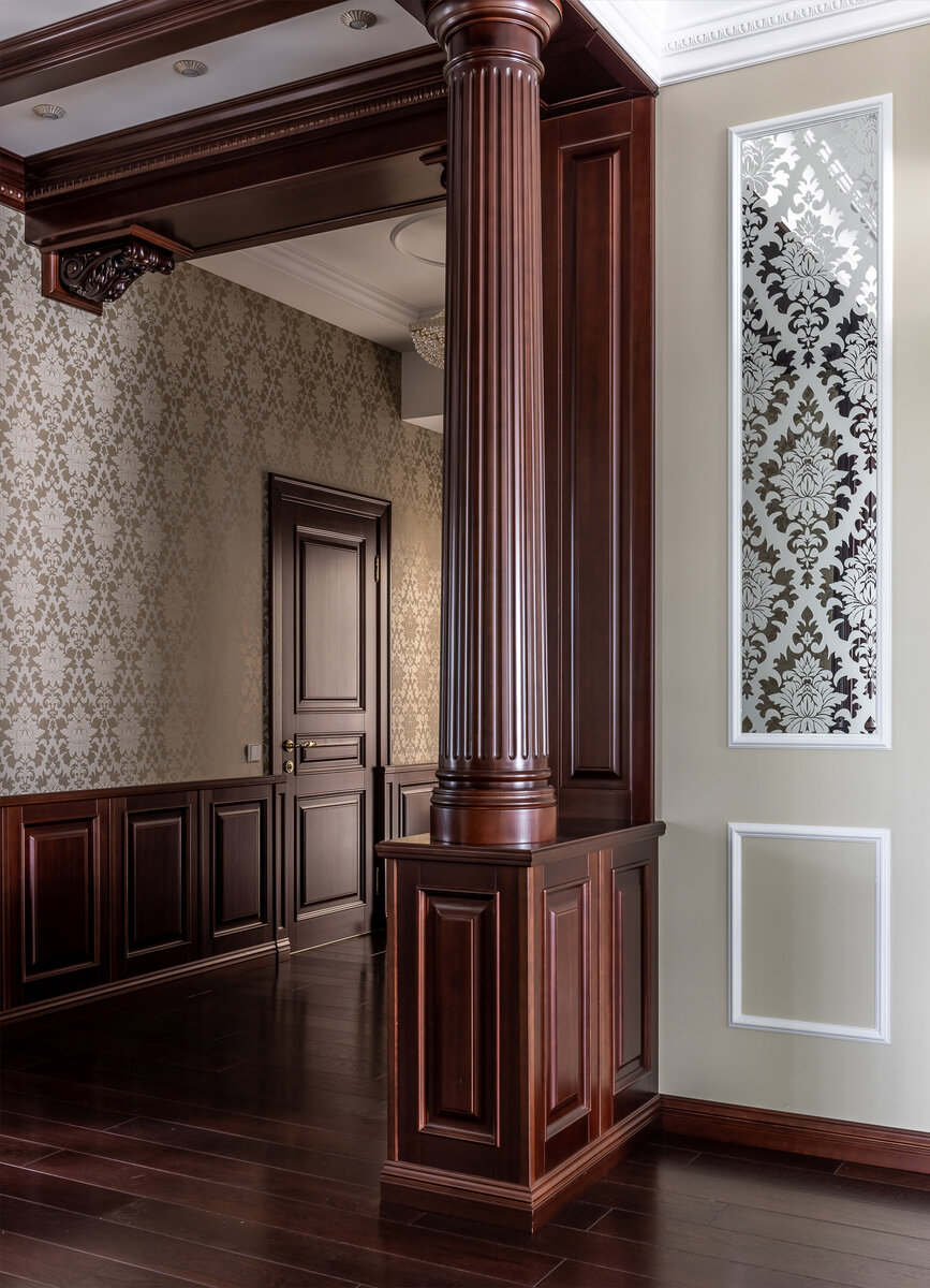 Шпон анегри отлично тонируется от рыжего до шоколадного оттенков — выглядит красиво и роскошно. Благодаря чему заслужил популярность в классических интерьерах для панелей, кабинетов и кессонных потолков.
