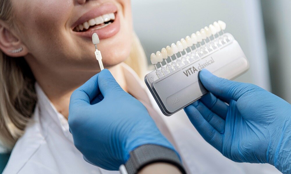 На фото: Финальная окраска коронок из керамики для создания такого же оттенка и переливов, как у соседних родных зубов.