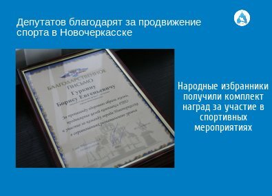 Глава администрации Новочеркасска Юрий Лысенко и начальник управления по физической культуре и спорту Елена Зленко выразили свою признательность за пропаганду здорового образа жизни, продвижения целей комплекса ГТО и участия за команду города в соревнованиях регионального уровня депутатам городской Думы, сотрудникам администрации и представителям спортивной общественности города. Награды из рук сити-менеджера Юрия Лысенко и главы города Николая Горкавченко получили депутаты Борис Гуркин, Иван Шевченко, благодарственным письмом также награжден депутат Денис Денисов.