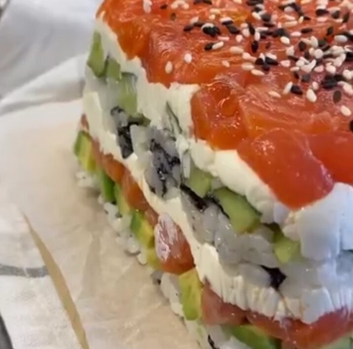 Суши-Торт Ингредиенты: 150 г риса для суши 165 мл воды Для заправки: 25 мл яблочного/рисового уксуса + 1 ст.л. сахара+1 ч.л. соли 300 г слабосоленого лосося 300 г сливочного сыра 3 листа нори 100 г огурца 1 авокадо Кунжут - для подачи Приготовление: Рис тщательно промываем водой несколько раз до прозрачной воды. Заливаем чистой водой и доводим до кипения. Ставим огонь на минимум и варим 15 минут, не приподнимая крышку. После этого выключаем огонь и даем рису постоять еще 15 минут под крышкой. Добавляем заправку и перемешиваем. Нарезаем в рис нори и снова перемешиваем. Лосось, огурец и авокадо нарезаем кубиками. Форму застилаем пищевой пленкой так, чтобы края свисали. Теперь выкладываем слоями: лосось, сливочный сыр, огурец, рис из нори, сливочный сыр, лосось, авокадо. Заворачиваем края пищевой пленки и убираем в холодильник как минимум на 30 минут.