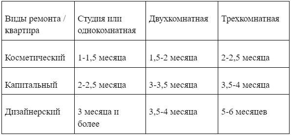 При оценке сроков на ремонт квартиры необходимо учитывать такие факторы как площадь жилого помещения и тип ремонта. Разумеется, «косметика» потребует меньше времени, чем капитальный или дизайнерский ремонт, а «трешку» придется ремонтировать дольше, чем «однушку» или студию. Многое зависит и от отделки – чистовой или черновой. В приведенной ниже таблице указаны примерные сроки ремонта.