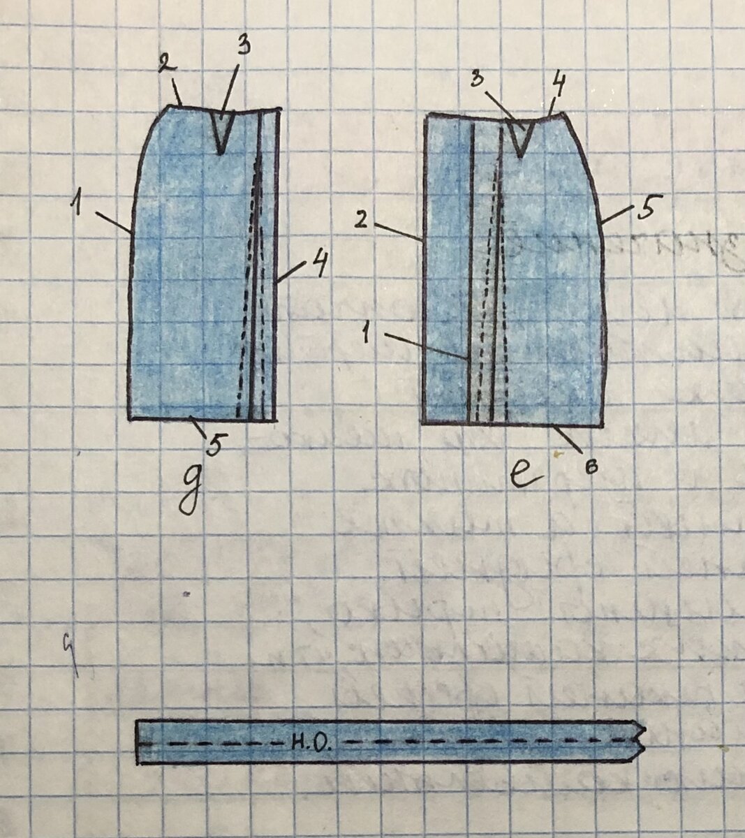 д- переднее полотнище юбки 1-боковой срез 2-срез талии 3-вытачка от среза талии 4-середина переднего полотнища 5- срез низа е- заднее полотнище юбки 1- середина заднего полотнища 2- сгиб/срез заднего полотнища/ внутренний сгиб складки 3- вытачка 4- срез талии 5- боковой срез 6- срез низа пояс