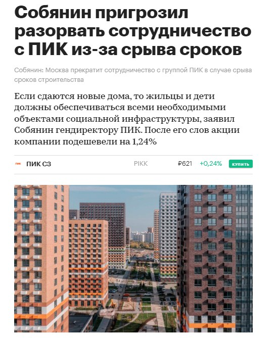 Здравствуйте, друзья. На моем канале уже выходили статьи про плюсы и минусы домов, которые строит ПИК. Сегодня вышла еще одна новость связанная с этой скандальной компанией. В статье про минусы ЖК ПИК я обращал ваше внимание на детские сады и школы, которые застройщик иногда превращает в частные, а иногда и в долгострой. Все потому что продать квартиру в человейнике намного выгоднее, чем обустроить жизнь людей с помощью необходимой инфраструктуры. Наконец-то на застройщика, который по моему мнению, уродует Москву, обратил и внимание мэр города - Собянин. Мэр заявил о невыполнение планов строительства компанией необходимой инфраструктуры в уже сданных ЖК. И сказал, что Москва в любой момент может разорвать сотрудничество с компанией, если такое будет продолжаться. На днях Собянин побывал в новом ЖК от ПИК - Люблинский парк- и обратил внимание на то, что застройщик уже сдал 200тыс метров жилья. Но при этом до сих пор не работают школа и детский сад. «Мне все равно на ваши графики: если