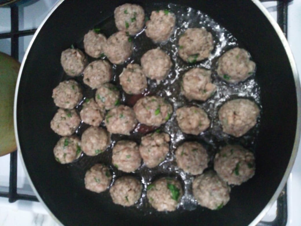 Достала фарш - 400 грамм, разморозила, добавила чеснок - 4 зубчика, петрушки - по вкусу, соль и перец, яйцо разбила. Налепила фрикаделек, обжарила их на сковороде в растительном масле с двух сторон.
