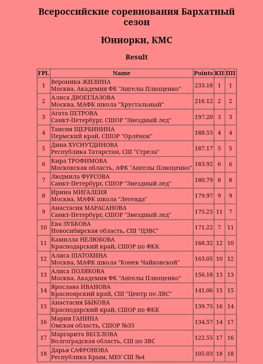 Для юниорок завершился второй этап серии Гран при России «Бархатные сезоны» и по результатам двух соревновательных дней итоговая турнирная таблица выглядит следующим образом. Вероника Жилина. Очень-очень радостно за Нику. После череды серьёзных срывов и неудач удалось выиграть данный турнир и неплохо прокатать обе программы( если брать во внимание 5 элементов ультра си) КП можно сказать на данном этапе удалась на 100%. В ПП пошла на 4 элемента ультра си: четверной сальхов, два четверных тулупа и тройной аксель. Сальхов и каскад четверной тулуп-двойной тулуп удались замечательно. На трикселе была помарка на выезде, а с четверного тулупа во второй половине программы девушка упала. Неплохо! Есть недочёты и ошибки, но гораздо лучше. Выбор программы спорный, но тренерскому штабу виднее. Поздравляю Веронику с победой и желаю ей стабильности! Алиса Двоеглазова. Замечательная программа, очень идет и хорошо раскрывает Алису. В произвольной программе девушка заявила 3 элемента ультра си: два че