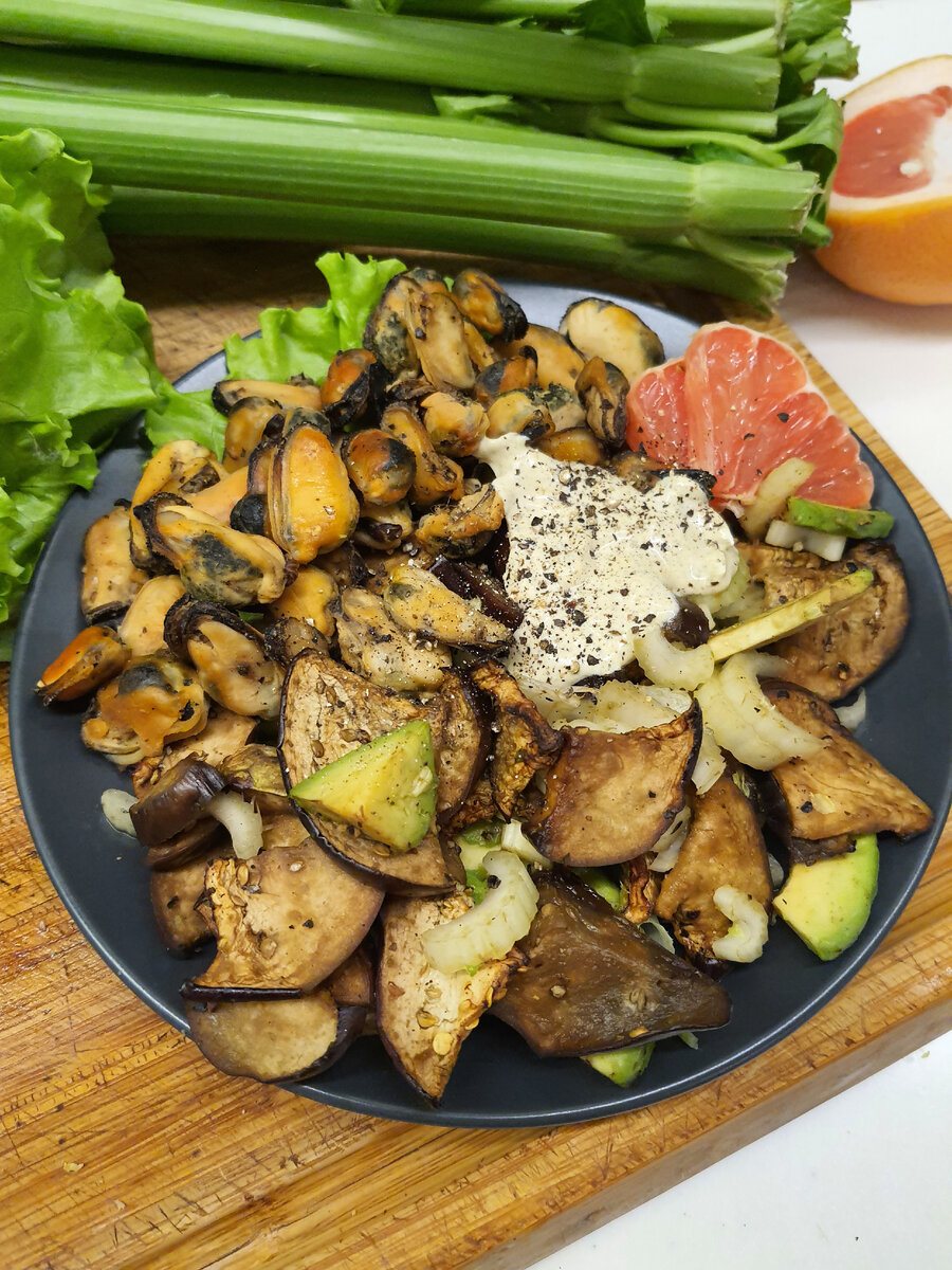 1. Салат из сельдерея, баклажанов и авокадо. Мидии.