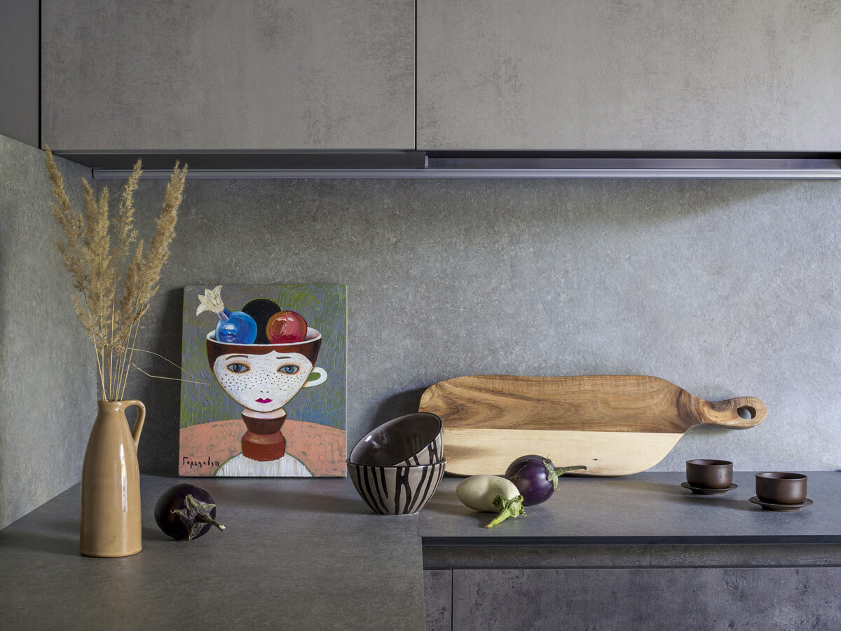 Пастельная цветовая гамма стала одним из пожеланий клиентки – Елена выбрала тёмно-серый цвет как основной для большинства помещений, например, на кухне он продолжается не только на гарнитуре, но и на потолке. Такой приём позволил скорректировать не самую удачную форму помещения. А вот в гостиной и прихожей компанию серому цвету составили молочный и бежевый, в них окрашены фрагменты стен и потолок.