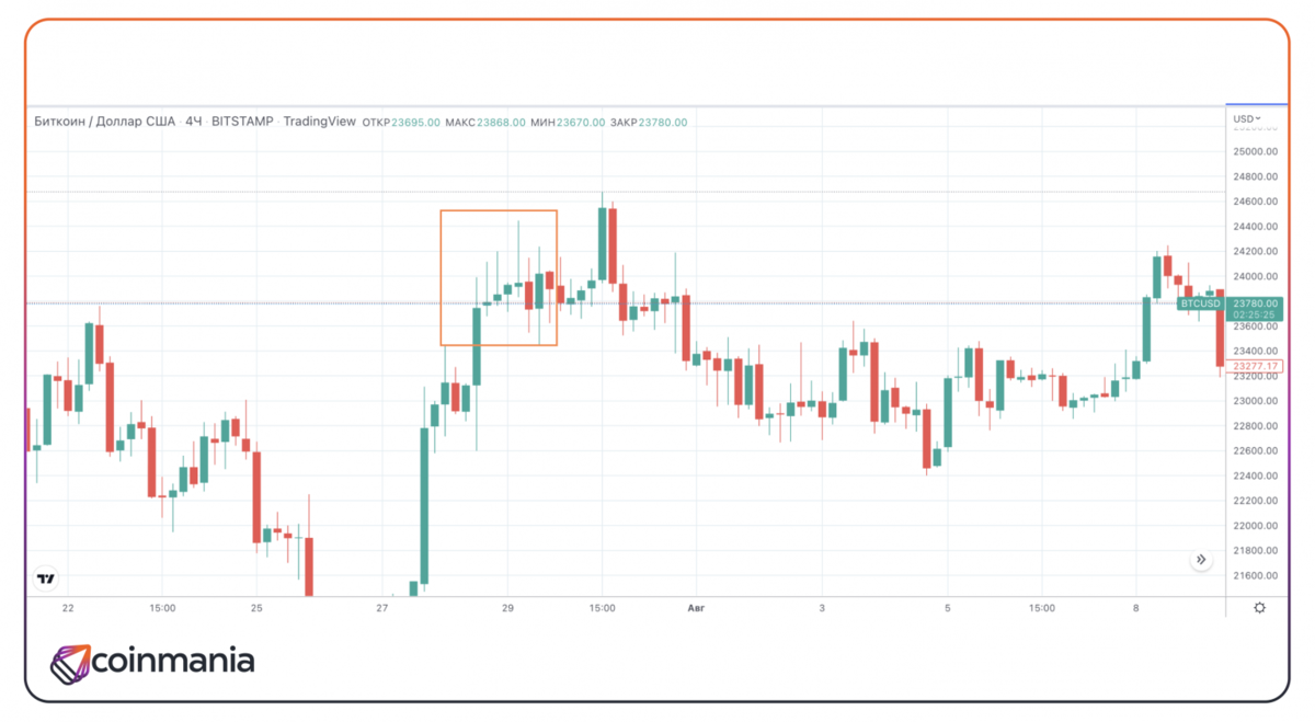 Например, на четырехчасовом графике пары Биткоин/Доллар США видно, что цена сформировала большое количество «падающих звезд»*. При этом цена не разворачивалась и продолжала торговаться в восходящем тренде в течение следующих двух дней.