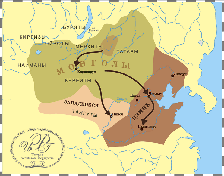 Весной 1206 года на съезде монголских племен (великом курултае) Тэмуджин был провозглашён Великим ханом над всеми племенами и получил титул «каган», приняв имя Чингис. Соперников и конкуренов у него не было, в его владения входили бесконечные монгольские степи.
