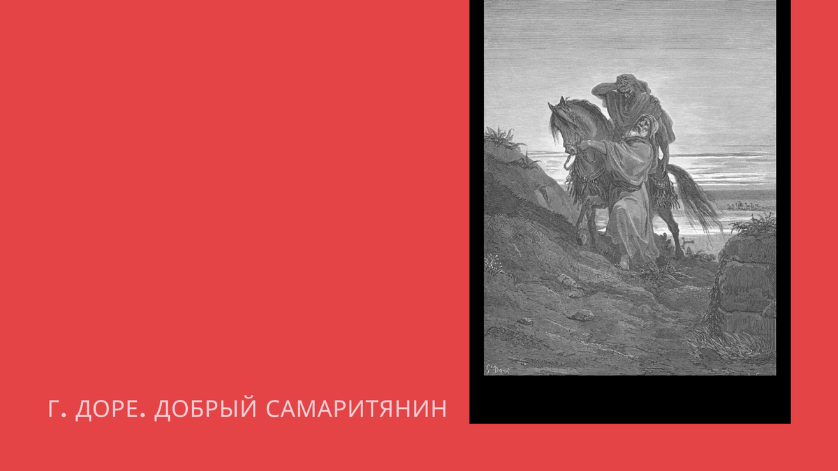 В ответ получает притчу о человеке, на которого напали разбойники и еле живого бросили на дороге. Мимо шел священник и не помог, потом левит тоже прошел мимо, а самарянин, с которыми, как я уже сказала, у евреев была острая неприязнь, перевязал раны, привез в гостиницу и заплатил, чтобы о нем позаботились. В завершении рассказа, Иисус спросил:
