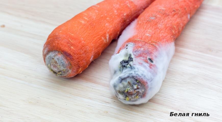 Распространенное грибное заболевание, поражает самые разные культуры, даже деревья и кустарники. На корнеплодах моркови проявляет себя размягчением и водянистостью тканей при отсутствии гнилостного запаха. На пораженных местах быстро формируется плотный белый налет, напоминающий вату. Иногда налета может не быть, болезнь определяется только по прогрессирующему размягчению корнеплодов. Распространению болезни в хранилище способствуют высокая температура (выше +20 °С) и влажность более 90%.