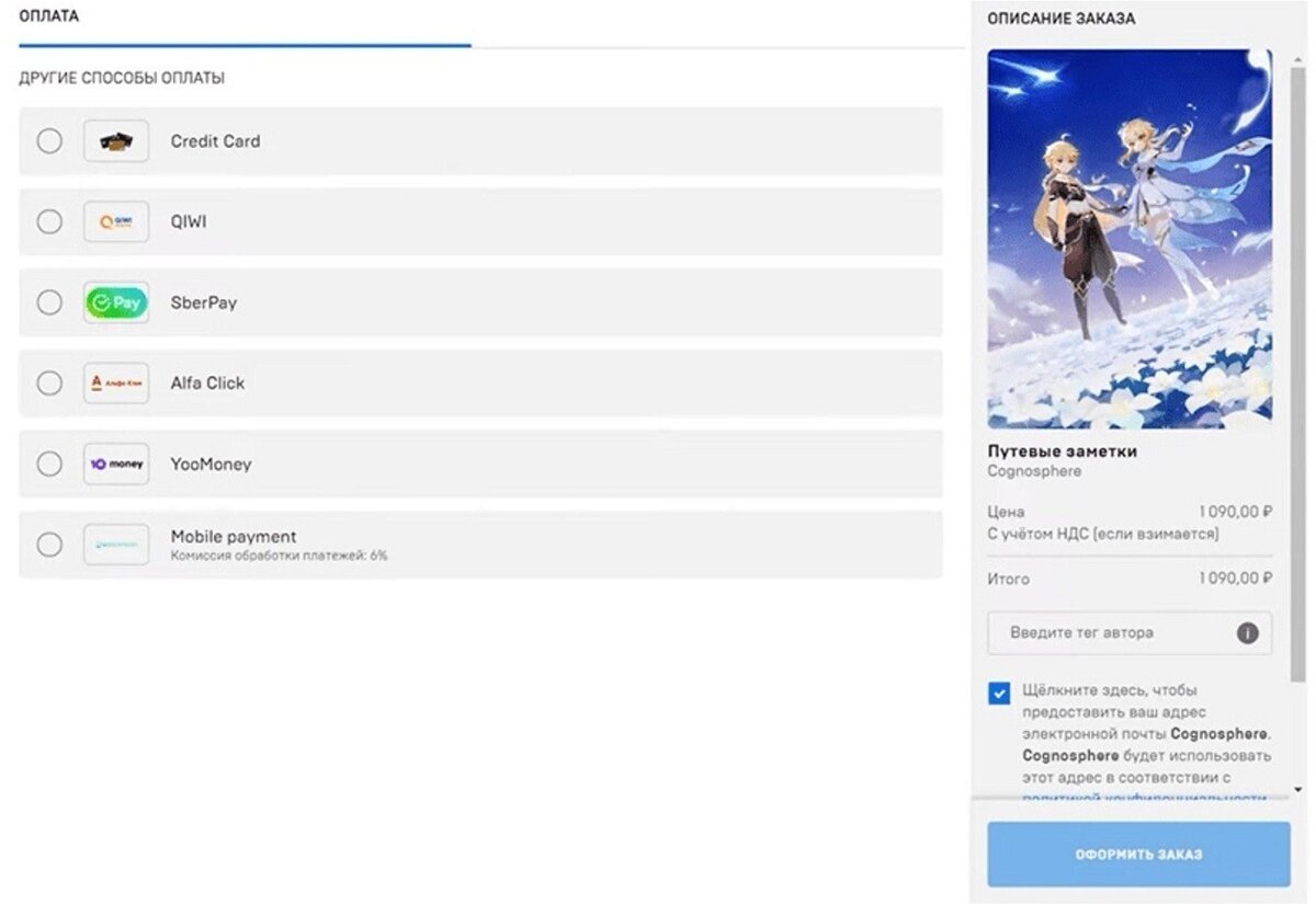 Несмотря на трудности с пополнением аккаунта и покупкой валют в Genshin Impact, приобрести кристаллы в игре все еще можно несколькими способами. Рассказываем как. На данный момент существует несколько вариантов покупки внутриигровой валюты: через сервис Qiwi, игровой магазин Epic Games Store, донат через Сбербанк или с мобильного счета. Как задонатить в Genshin Impact через Qiwi Один из самых простых способов. Для этого зайдите на официальный сайт игры и залогиньтесь. Затем найдите вкладку «Пополнение» и выберите нужного персонажа. В окошке выбора способов оплаты кликните на Qiwi и вбейте номер своего кошелька. Как задонатить в Genshin Impact через Epic Games Store Если у вас есть лаунчер этого магазина, то скачайте Genshin Impact на ПК через него. Еще не приспособили Epic Games Store на свой ПК? Не беда, скачайте его с сайта магазина. Как только клиент игры установится, перейдите в настройки и нажмите на шестеренку в правом верхнем углу. Во вкладке «Ресурсы игры» ищите раздел «Поиск и