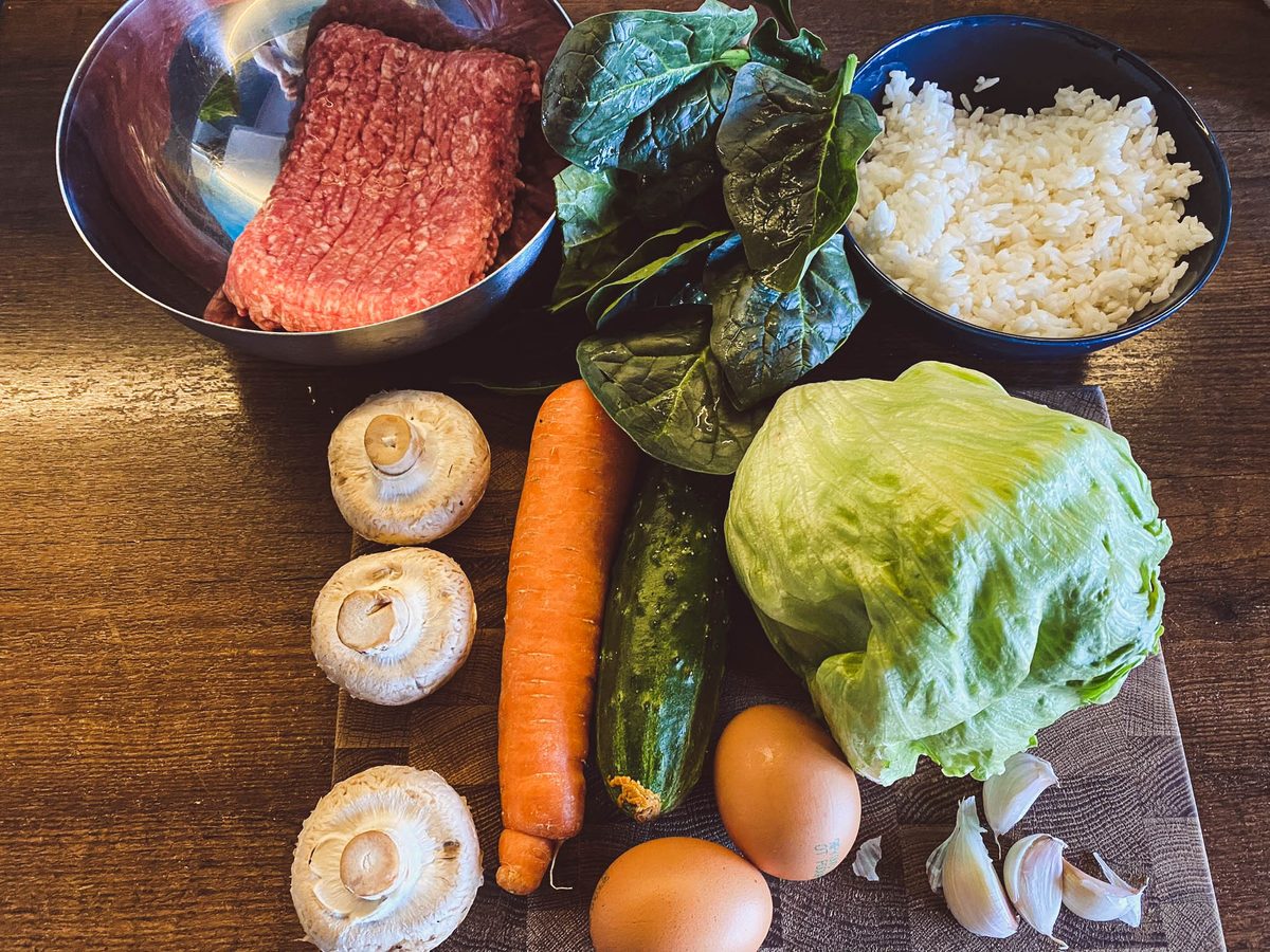 Вокруг риса секторами выкладывай мясо, шпинат, огурцы, айсберг, грибы с морковью.