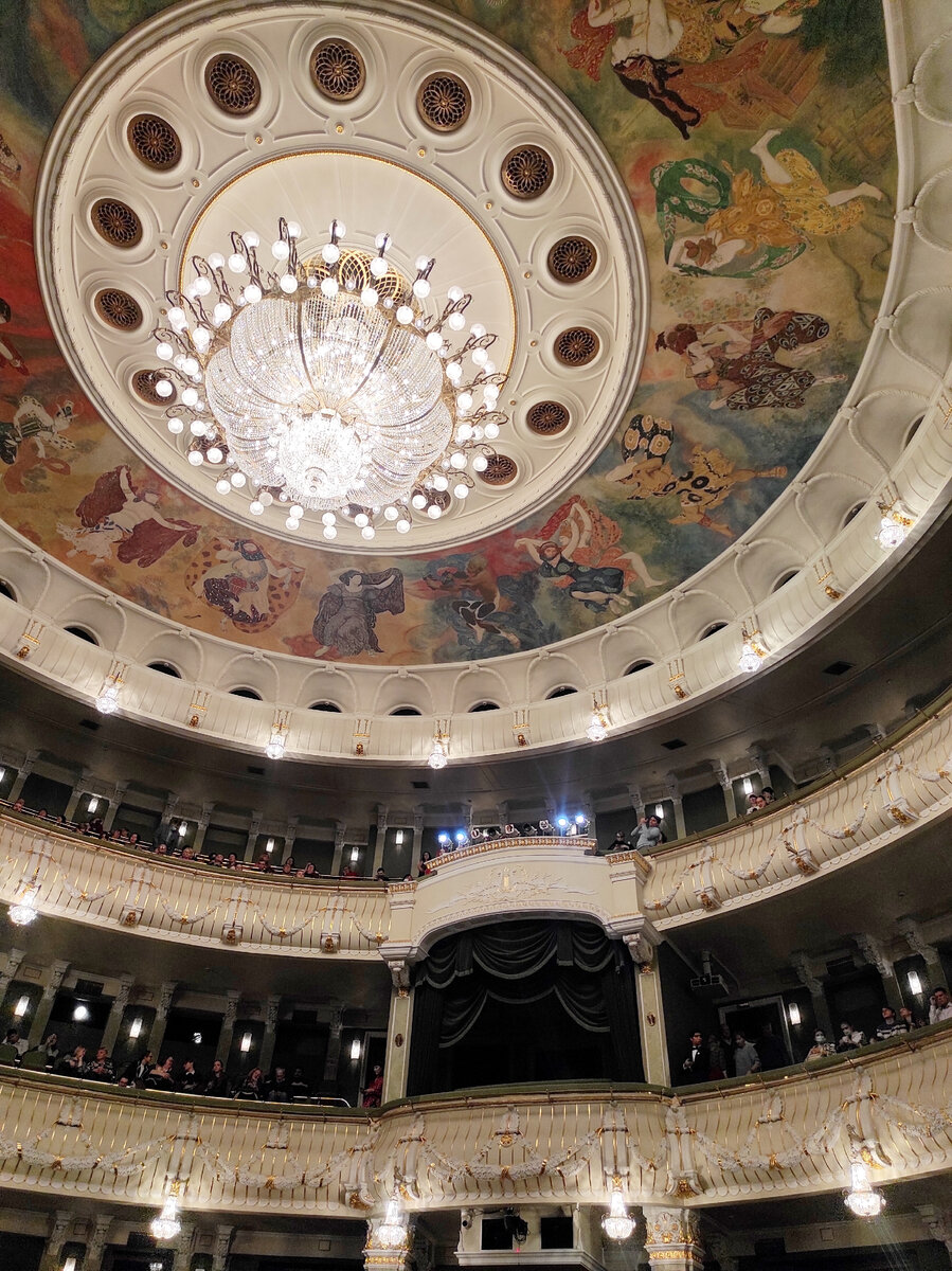 Новая сцена Большого театра, построенная рядом с историческим зданием, открылась в 2002 году. Зеленоватые тона кресел, лож, стен, также спокойный бежевый и белый с золотыми акцентами в интерьере, красивые спиральные лестницы, наборной паркет, люстры, оформление царской ложи, имитирующее оформление царской ложи на исторической сцене. Отделка, выполненная особым видом штукатурки, имитирующей камень, что позволило отказаться от использования самого мрамора. Новая сцена выглядит очень впечатляюще! Но изюминка этого роскошного интерьера безусловно потолок. Шикарная люстра в классическом стиле и яркая необычная роспись. Плафон зрительного зала был расписан по эскизам Льва Бакста, выдающегося художника, стенографа, дизайнера, участника знаменитых проектов Сергея Дягелева. Роспись выполнена в мастерской Зураба Церетели. По рисункам уже самого Церетели в его же мастерской выполнен и сценический занавес. Роспись плафона представляет собой красочный хоровод из тринадцати фигур персонажей в кост