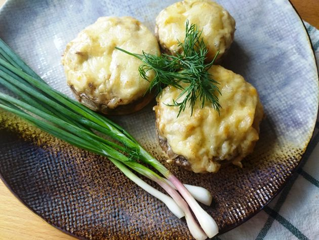 11. Сочные вкусные грибы под сырной корочкой готовы. Их можно украсить зеленью и подавать к столу