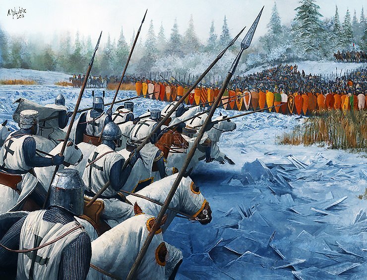 Ледовое побоище или битва на Чудском озере – битва, произошедшая на льду Чудского озера 5 апреля (12 апреля) 1242 г. с участием ижоры, новгородцев и владимирцев, возглавляемых Александром Невским, с одной стороны, и войсками Ливонского ордена – с другой. Ледовое побоище является одним из самых знаменитых сражений в истории России. Если бы русские войска потерпели поражение в битве, история России могла пойти в совершенно другом направлении. Подготовка к битве После того, как шведы двумя годами ранее проиграли Невскую битву, германцы-крестоносцы начали более серьезно готовиться к военному походу. Стоит заметить, что для этого Тевтонский орден выделил определенное количество воинов. За 4 года до начала военной кампании магистром Ливонского ордена избрали Дитриха фон Грюнингена. Ряд историков полагают, что именно он выступил инициатором похода на Русь. Кроме всего прочего крестоносцев поддерживал Папа римский Григорий 9, организовавший в 1237 г. крестовый поход на Финляндию. Спустя пару л