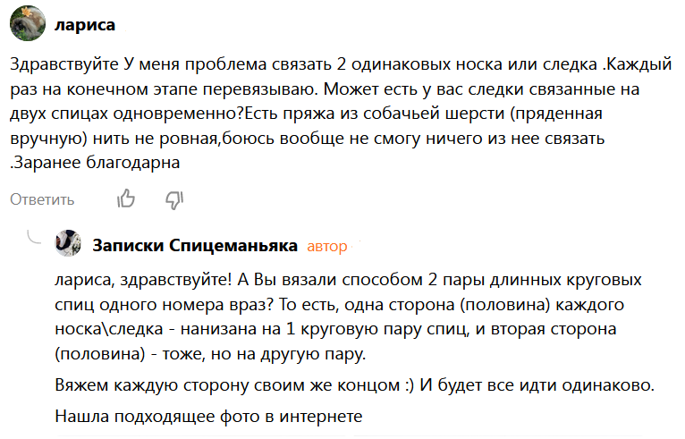 Комментарий напомнил, о чем я хотела рассказать, да круговоротище событий, сами понимаете: Аналогично так вяжу для варежек, рукавов, штанин... Это параллельное вязание. И оно в самом деле убыстряет вязание парных вещей, отсутствуют дырочки по бокам, которые нередко бывают при вязании волшебной петлей (magic loop). А есть еще вторая причина покупать 2 пары одинаковых круговых спиц - это круговое же вязание. Случайно так сделала, когда, имея 2 одинаковые пары, я попробовала облегчить себе провязывание первого ряда на спицах длиной 40см, и не шло родными спицами (недостаток количества петель, впритык было), но пошлО, когда использовала внешнюю пару. Не нравится мне использование скажем 100см пары, растяжка "ушей" лески по бокам для замыкания в круг, и провязывание: часто это ведет к перерастянутым промежуткам между петлями, особенно если это лицевое полотно и пряжа не пружинистая. Да и медленнее так вязать. Спицы в леске и в стыке изнашиваются быстрее. Тогда спасает вот это метод - вто