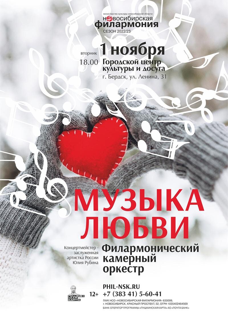 Во вторник, 1 ноября в 18:00 в большом зале ГДК Бердска состоится концерт «Музыка любви» Филармонического камерного оркестра Новосибирской Государственной филармонии. Филармонический камерный оркестр и классика понятия почти тождественные. И если классика названа феей – это тоже недалеко от истины. Стоит ей взмахнуть волшебной палочкой и хоровод любимых мелодий закружит нас в своём танце. Танцевальной музыки в нашей программе действительно очень много – от знаменитого Менуэта Боккерини до не менее знаменитого Гавота Прокофьева, а также восхитительные танцы Бизе и Брамса! Фея вспомнит и о титанах барочной музыки – Генделе и Бахе, а если речь зайдёт о «Временах года», то мы услышим зарисовки из цикла П.И. Чайковского и, конечно, полные страсти танго Астора Пьяцоллы. И все эти замечательные мелодии-музыка любви, ведь музыка процветает благодаря тому, что композиторы десятилетиями пишут любовные послания своим реальным или воображаемым музам. В этом убеждаешься и когда слушаешь концерт Фил