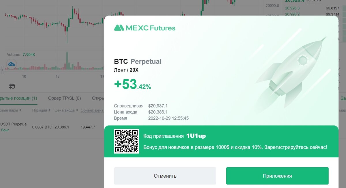 53% удалось заработать на биткоине за сутки :). Подтянул стопики. Коллеги, доброго дня, вчерашняя сделка дает уже 53% роста, жду пробития предыдущего хая на 21000 по битку. Ожидания у меня такие: 15m TF. Биткоин сформировал уровень вблизи круглого числа 21000 и на данный момент поджимается к этим значениям. На текущий момент тренд рынка восходящий поэтому вход в пробой плотности на круглом числе с ожиданием забрать импульс и развитие движения. Держу до 21500 по битку. Торгую на бирже Mexc. Регистрируйтесь со скидками https://www.mexc.com/ru-RU/register?inviteCode=mexc-Yandzen, торгуйте со мной и забирайте бонус до 1000 долларов на торговлю. Всем удачи)