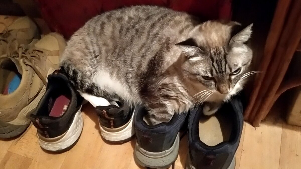 В один вечер я вдруг понял, что не просто живу с "двумями" котами, а что эти коты - значимые величины. Чернуха - царица горы, а Белка - кроссовочный олигарх. И обоих надо соответствующе кормить. Но на этом видео они сыты, довольны и сонны. Вечер-то поздний.
