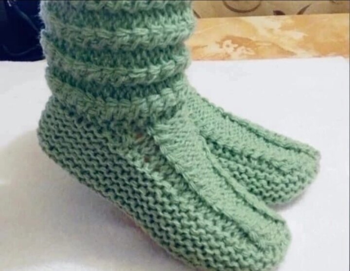 Описание : Набираем 56 петель. Провязываем 10 рядов цепочки ( 1 ряд - лиц. 2 р. изн. 3 р - 1 изн, 1 снять, нить перед работой и т. д. 4 ряд - 1 лиц. 1 снять нить за работой После делим все петли на три части (21 -14 - 21) и вяжем только среднюю часть (14 петель)здесь сами смотрите, на какой размер. Примерно -10 см. Это длuна мыска, так что можно самой варьировать длину, в зависимости от размера ноги.. По краям с боковой косички по 21 петлю с каждой стороны. Вяжем 8 рядов узором-цепочка (полнота башмачка). Подошва- вязать на центральных 14 петлях платочной вязкой, захватывая в конце ряда по 1 с боковых спиц ( то есть провязывая вместе последнюю петлю с центральной спицы и первую с боковой спицы). Ближе к концу вывязывания подошвы убавила 2 петли, подняла петли по бокам-11 пет и провязала до конца. Верх сапожка - набрала 30 петель, провязала 5 рядов платочной вязкой, в последнем ряду равномерно прибавила 6 петель, вязала 4п. платочная вязка, 1 изн 2 лиц,1 изн (в изнаночном