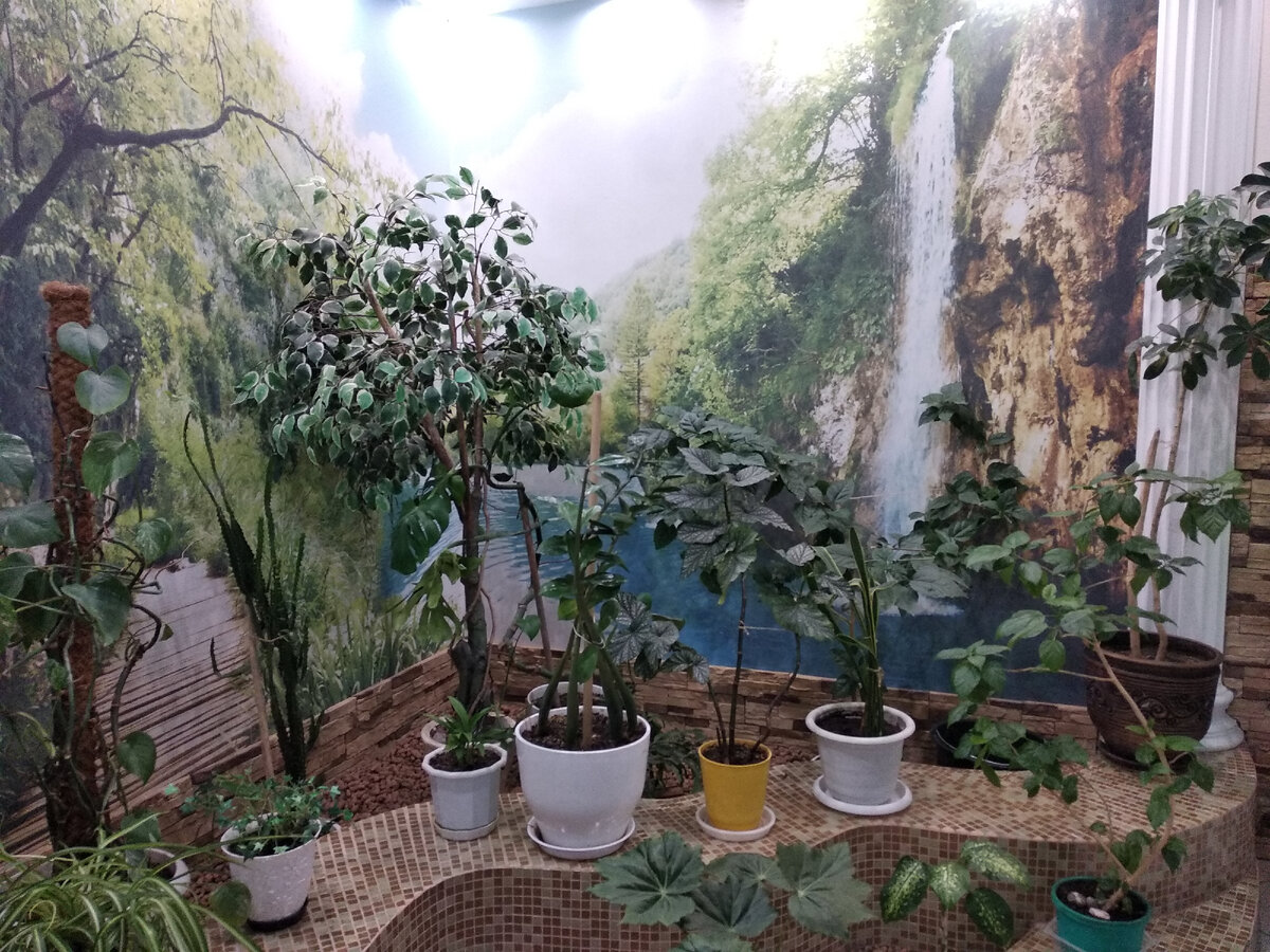 Сегодня хочу рассказать и показать, какой зимний сад есть в санатории. Этот чудный уголок размещается в одном из теплых переходов в водогрязелечебницу. В период между процедурами мы любим здесь отдохнуть, послушать спокойную музыку.
