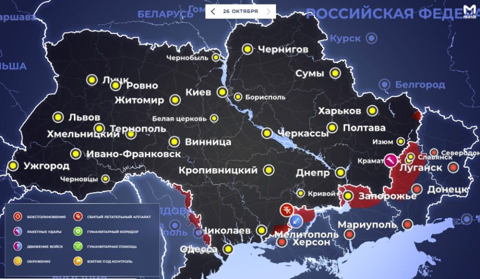Рассмотрим по подробнее, что происходит на территории Украины.. Начнём с хроники событий боевых действий на Старобельском направлении фронта с 15 по 20 октября 2022 года. 18 октября 2022 года Российские войска атаковали село Горобьёвка, где закрепились и прижали противника к реке Оскол. Подразделение ВСУ понесли большие потери. В селе Синьковка создаются опорные пункты, дороги также были заминированы. Украинские военные предпринимали атаки и хотели установить контроль над высотами села, Кисловка и Котляровка, которые были ключевыми для обороны, но это им не удалось. Несмотря на потери, ВСУ не удалось захватить линию обороны Вооружённых сил российской федерации. Вдоль реки Жеребец от Райгородка до Терн, ВСУ предприняли несколько безуспешных попыток создать плацдарм на восточном берегу. Российскими артиллеристами был нанесён удар по противнику в районе сел Стельмаховка, Розовка, Карповка и Ивановка. 17 октября, была сорвана подготовка войск ВСУ для форсирования реки. Украинское командо