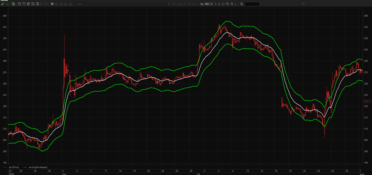- Верхняя и нижняя линии получаются в результате смещения центральной SMA20 на фиксированное количество стандартных отклонений Вверх и вниз.
