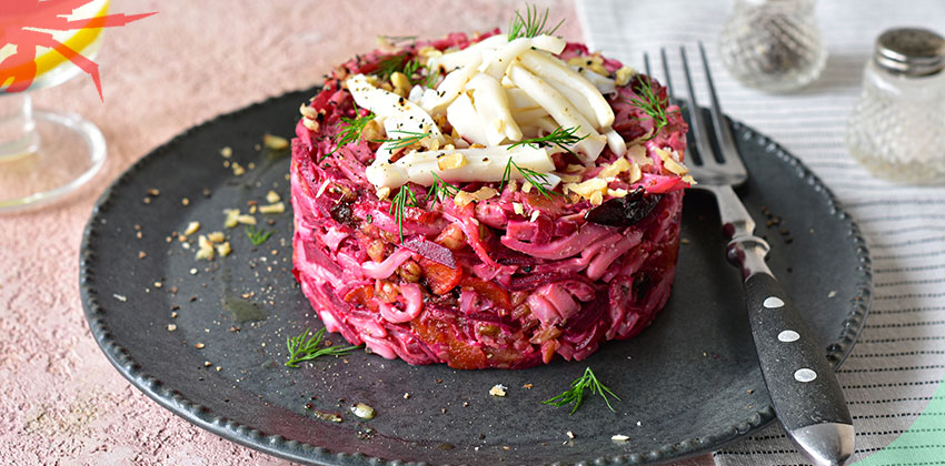 Ингредиенты: Для начала запечем свеклу. Разогреем духовку до 180 градусов. В фольгу заворачиваем свеклу. Готовим 50 минут. Затем достаем, даем остыть, очищаем от кожуры и нарезаем соломкой. Берем кастрюлю, доводи воду до кипения, опускаем кальмара и тут же включаем. Накрываем крышкой и оставляем на 10 минут. Затем достаем кальмара, даем остыть и нарезаем соломкой. Промываем курагу и чернослив, заливаем кипятком на 10 минут. Затем даем им остыть и мелко нарезаем. Чеснок очищаем от шелухи, пропускаем через пресс. Грецкие орехи подсушиваем на сковороде, затем измельчаем. Берем салатник, кладем в него все подготовленные ингредиенты, перемешиваем, заправляем майонезом и еще раз тщательно перемешиваем. Блюдо готово. Приятного аппетита! Источник: https://wildcrab.ru/news?id=1762