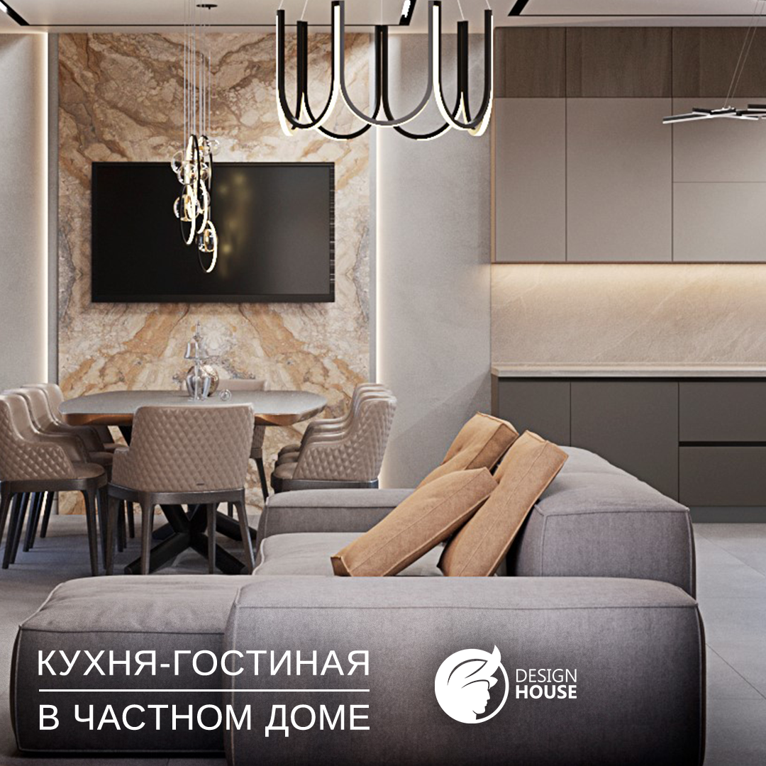 Нюдовые спокойные оттенки, четкое визуальное разделение на кухонную и гостиную зону💫. Добавили бы что-то ещё в этот проект?