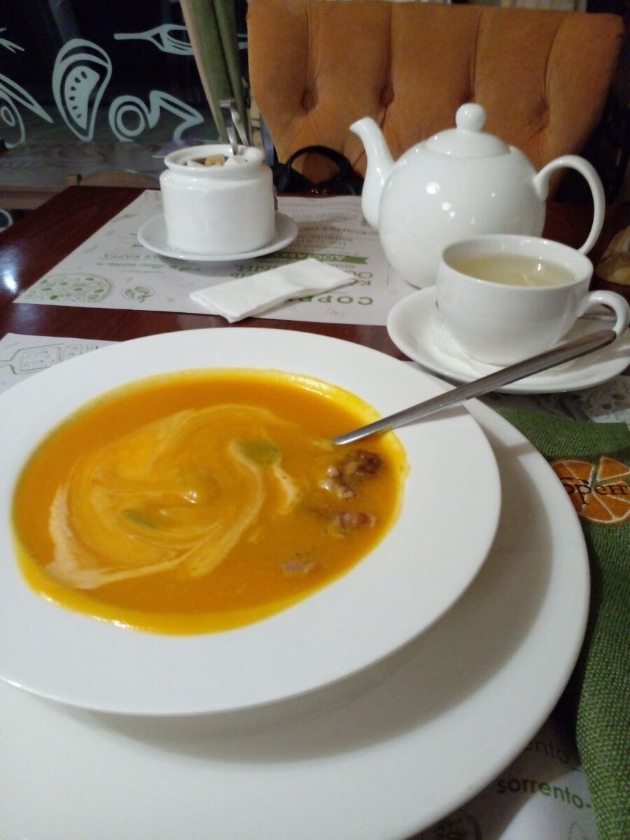 Потом зашла её коллега и спросила ,может помощь нужна, на что моя медсестра сказала, что теперь придется попробовать с кисти. И только вот с третьей попытки и получилось. Но самое ужасное что медсестра мне показала, как та моя кровь с первой пробирки, что удалось взять немного уже так загустела, что перестала течь и стала как желе, затромбировалась, хотя времени прошло совсем мало. Меня это если честно шокировало, никогда еще не видела такого, чтобы прям на глазах в течении нескольких минут и такой эффект. Вообщем есть над чем задуматься и срочно принимать меры. Мне терапевт еще полгода назад прописала разжижающий препарат варфарин, но начав его принимать , я заметила что у меня стала болеть голова. Я сразу не стала принимать из-за высокого холестерина и гепатоза , ну как врач мне сказала, а начала принимать только через 3 месяца, после того как мне сказали что я пришла в норму. Пила этот препарат до недавнего времени и когда в очередной раз разболелась голова, я решила больше не принимать. И вот к чему это привело. Короче врачи нас не лечат, а подсаживают на таблетки. Мало того что первый эндокринолог в конце приёма спросила - вам какие препараты подешевле или подороже написать? Меня это так расстроило, что за отношение такое к пациентам, не понимаю, мы что на базаре, или по одежке можно так лечить людей. Думаю в институте надо им еще включить предмет этики в общении с пациентами. Причем это уже второй врач который так разговаривает. Я не могу сказать что я плохо одеваюсь, нормально как все, конечно не в брендовые вещи, но причем тут вообще внешний вид или например национальность, я заметила что здесь некоторые врачи и не только страдают предвзятым отношением к азиатам и другим национальностям. Если ты врач лечи как положено, а покупать дорогие препараты или аналоги, мы как то сами решим(прям накипело). Разве не так? После такого расстройства с забором крови, я решила компенсировать себе состояние и пошла завтракать в ближайшее ТЦ и в свой любимый ресторан Соренто. На мою удачу у них был суп-пюре из тыквы, а на второе я заказала котлету Пармеджано, но я была так голодна и увлечена что, быстро съела и не успела сфоткать её, а успела только суп.
