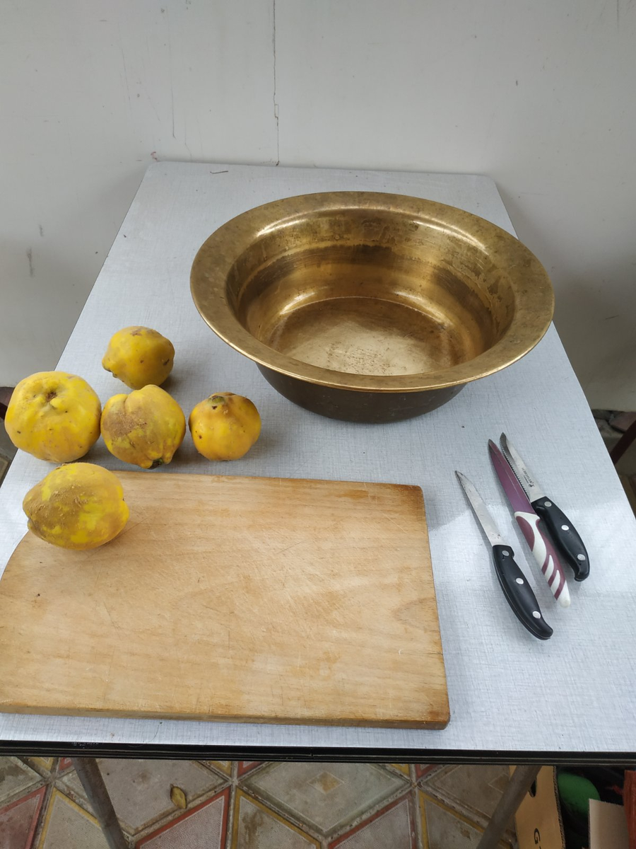 В сентябре она, айва, ещё незрелая. Начало октября холодным выдалось, особенно ночи. На рынках её было полно. Но - зеленоватая! А она должна быть цвета охры. Нашли. Купили. Аж 6 кг. Крупная, одна в одну, красавица. Но купили только за пару дней до отъезда. Сборы, суматоха...
