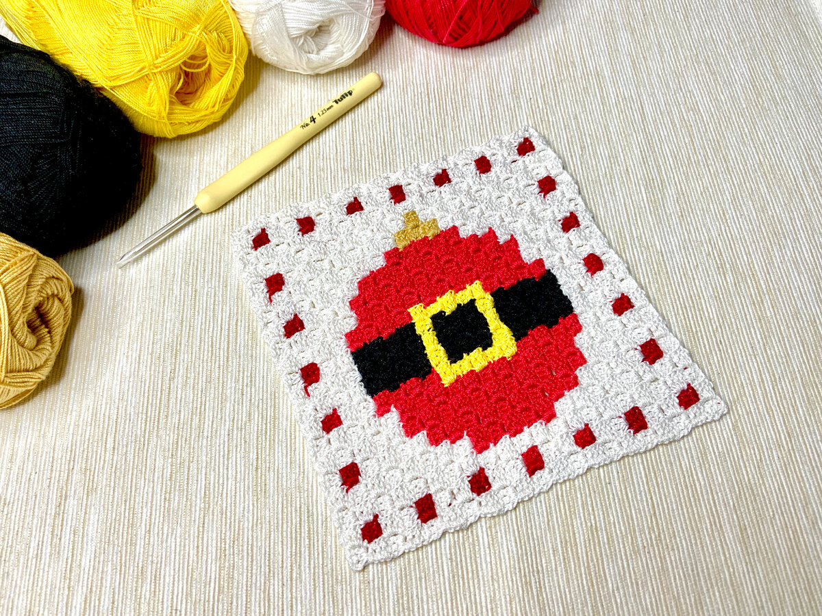 Схема для вязания крючком из угла в угол подставки под чашку "Елочный шарик костюм Санты".