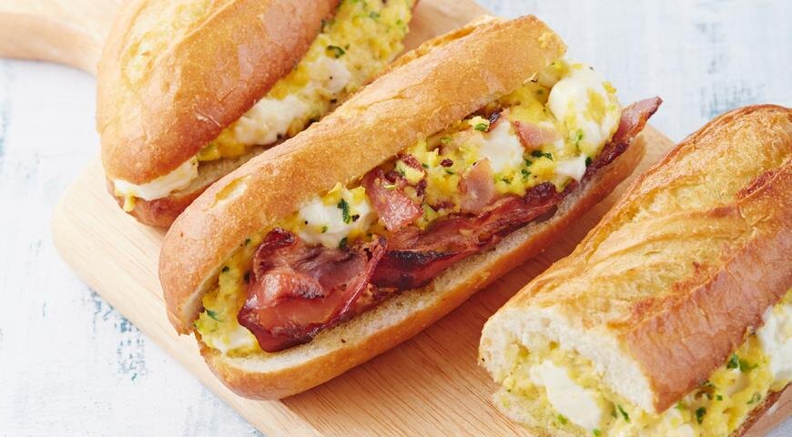 Горячий багет с яйцами-скрэмбл и брынзой ИНГРЕДИЕНТЫ ПОШАГОВЫЙ РЕЦЕПТ ПРИГОТОВЛЕНИЯ Шаг 1 Разогрейте духовку до 220 °С. Тонко нарежьте зеленый лук. Раздавите, очисти-те и порубите чеснок. Положите в кастрюльку с толстым дном нарезанное кусочками сливочное масло, лук и чеснок. Разбейте туда же яйца. Шаг 2 Поставьте кастрюльку на небольшой огонь. Готовьте, все время перемешивая и не давая яйцам зажариваться – они должны только схватиться – примерно 7 мин. У вас получится нежная влажная яичная масса. Снимите ее с огня и смешайте с раскрошенной брынзой. Поперчите. Шаг 3 Разрежьте багет вдоль пополам не до конца и раскройте как книжку. Выберите мякиш по центру обеих половинок и положите вместо него яично-сырную начинку. Закройте багет, щедро смажьте оливковым маслом и заверните в фольгу. Запекайте 10 мин. Дайте полежать в фольге 3–5 мин., затем разверните, разрежьте на части и сразу же подавайте. Приятного аппетита 👌