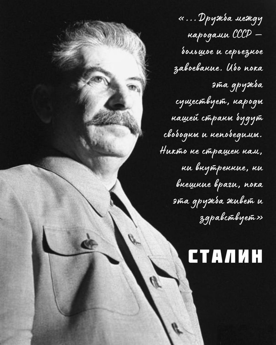 «...Дружба между народами СССР — большое и серьезное завоевание. Ибо пока эта дружба существует, народы нашей страны будут свободны и непобедимы. Никто не страшен нам, ни внутренние, ни внешние враги, пока эта дружба живет и здравствует»