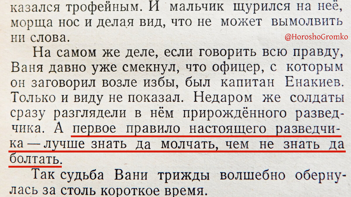 Завершает марафон по Валентину Катаеву и повести «Сын полка» цитата о том, какое первое правило настоящего разведчика. Вот, из какого эпизода эта цитата: «Сын полка», как мы уже знаем, про мальчика Ваню Солнцева, сироту, которого осенью 1944 года находят в лесу советские солдаты, принимают, как родного, и он становится - как и следует из названия - сыном полка. Для интереса (и правдоподобности) в начале повести Катаев делает сюжетный ход: когда разведчики приводят Ваню в полк, их командир, капитан Енакиев, естественно, приказывает отправить ребёнка в тыл. Ребёнок в тыл не хочет, а хочет остаться в полку, поэтому по дороге сбегает от своего провожатого и окружными путями приходит в штаб, где рассчитывает найти командира и убедить разрешить солдатам его «усыновить». Во дворе штаба Ваня встречает самого капитана Енакиева, но не знает, что это командир и есть, и просит его повлиять на самого же себя. Впрочем, вскорости мальчик догадывается, что перед ним Енакиев, но виду не подаёт, благ