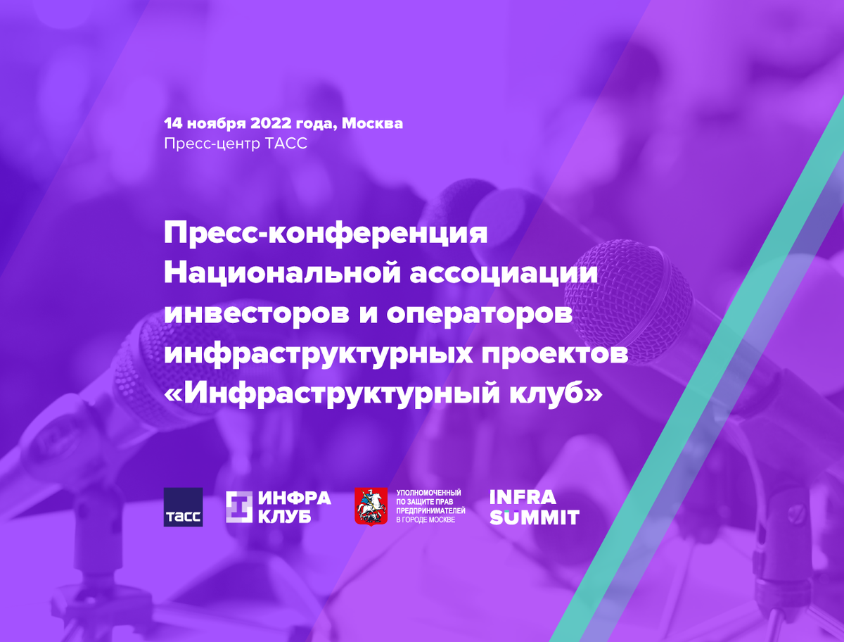 14 ноября 2022 года на площадке Пресс-центра ТАСС в Москве состоится пресс-конференция Национальной ассоциации инвесторов и операторов инфраструктурных проектов «Инфраструктурный клуб», посвящённая саммиту лидеров рынка инфраструктурных проектов InfraSummit.
