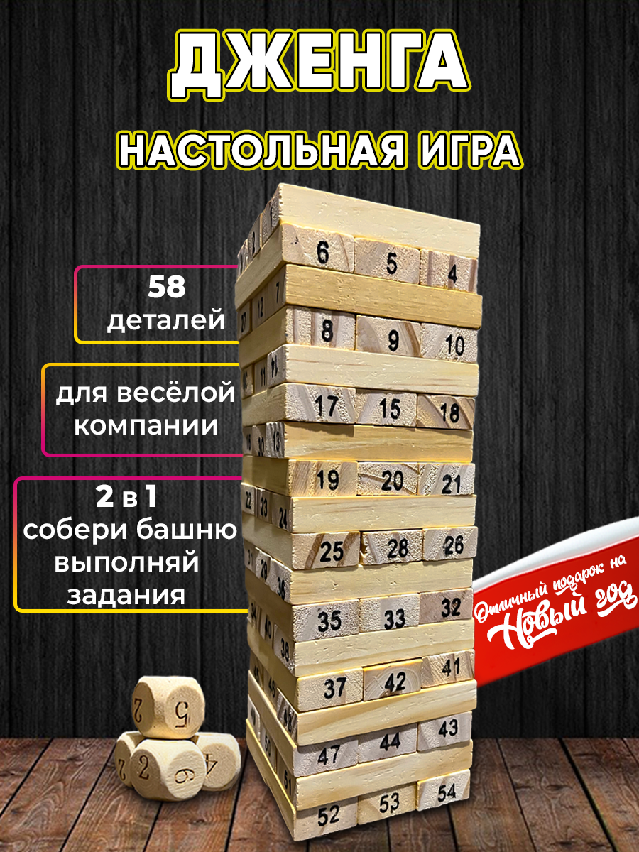 Настольная игра дженга подходит для детей и взрослых. Игра на удачу замечательно подходит для семейного досуга, праздника, вечеринки или как подарок ребенку. Падающая башня подходит для игроков разного возраста. Чем больше компания, тем веселее и интереснее игра. В башню с заданиями можно играть дома, на отдыхе, на вечеринке, в школе и детских центрах, в кафе, на даче. В комплект входит 54 деревянных бруска и 4 игральных кубика. Игроки должны по очереди доставать блоки из основания башни и класть их наверх, делая башню более высокой и менее устойчивой. Главная цель - положить блок так, чтобы не разрушить башню. Для тех кто решил, что это легко, можно кидать кубики и вытаскивать брусок с суммой или произведением выпавшей на кубиках. Для цветной джанги вытаскивать брусок с выпавшим цветом. Получается у вас ещё Дженга с заданиями в наборе. Развивающие игры - прекрасный подарок для детей. Если вам нужен подарок для девочки, подарок для мальчика или для подростка - игра дженга бум прекрасны