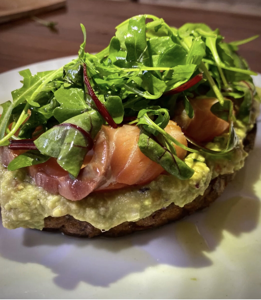Ингредиенты: Хлеб - 1 кусок Гуакамоле - 150 гр Лосось - 120 гр Микс зелени - 10 гр Сливочное масло - 20 гр Приготовление: Жарим хлеб на сливном масле, по 2 минуты, на среднем огне Выкладываем на тост гуакамоле Кладем лосось Сверху микс зелени Легкий быстрый завтрак готов!