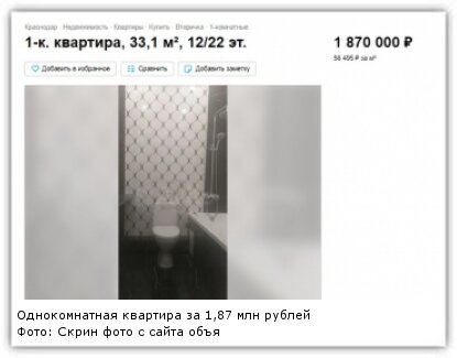 Жилье стремительно растет в цене в том числе в Краснодаре, но из-за обилия предложений о продаже на рынке, владельцы недвижимости вынуждены снижать цены, чтобы скорее продать объект. В итоге в столице Кубани можно найти квартиры, которые предлагают по ценам "докризисного" периода. Правда, располагается такая недвижимость не в центре города, но в обжитых районах с развитой инфраструктурой. Обзор однокомнатных квартир со свежим современным ремонтом на вторичном рынке, но в домах не старше 2012 года постройки, по низким ценам, которые предлагаются покупателям на популярной площадке объявлений, подготовило ИА KrasnodarMedia. Однокомнатная квартира за 1,87 млн рублей "Однушка" на улице Яцкова продается за 1,87 млн рублей. Площадь квартиры на 12 этаже в 22-х этажном доме — 33,1 квадратных метров. Таким образом, "квадрат" покупателю обойдется в 56,5 тысяч рублей. Это при средней цене квадратного метра в краевом центре по итогам октября в 110 329 рублей. В квартире сделан качественный ремонт.